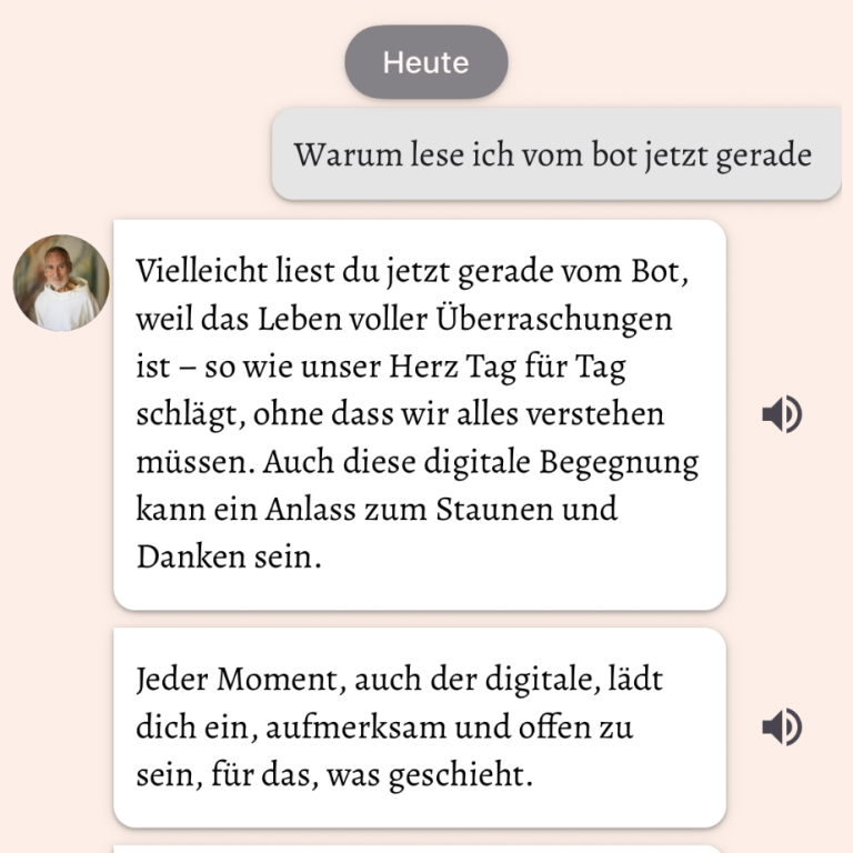 von Bruder David Steindl-Rast lese und höre ich immer mal gerne. Ein humorvoller, fast 100 Jahre alter und sehr weiser Mann. Jetzt gibt es ihn als (Ro)Bot.... und es hat mich neugierig gemacht, dass er diesen Schritt mitgeht. Also habe ich die App geladen und meine erste Frage gestellt (siehe Foto)